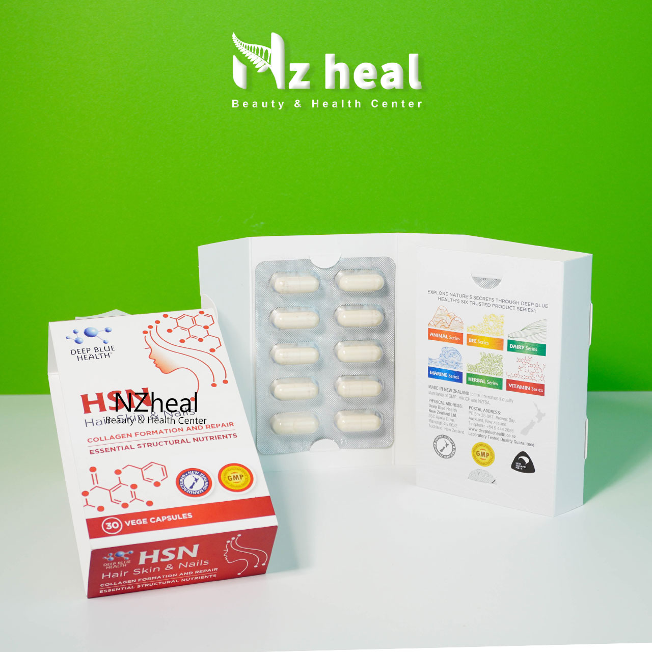 Viên uống Deep Blue Health HSN Hair Skin & Nails được bổ sung Vitamin C, Kẽm, Biotin và Selenium – nhóm vi chất quan trọng tham gia trực tiếp vào quá trình hình thành và tái tạo collagen. Nhờ đó, Deep Blue Health HSN hỗ trợ cải thiện làn da mụn, thúc đẩy phục hồi tổn thương và nuôi dưỡng làn da khỏe mạnh từ bên trong. Khi sử dụng HSN đều đặn, cơ thể nhận được những lợi ích nổi bật sau: