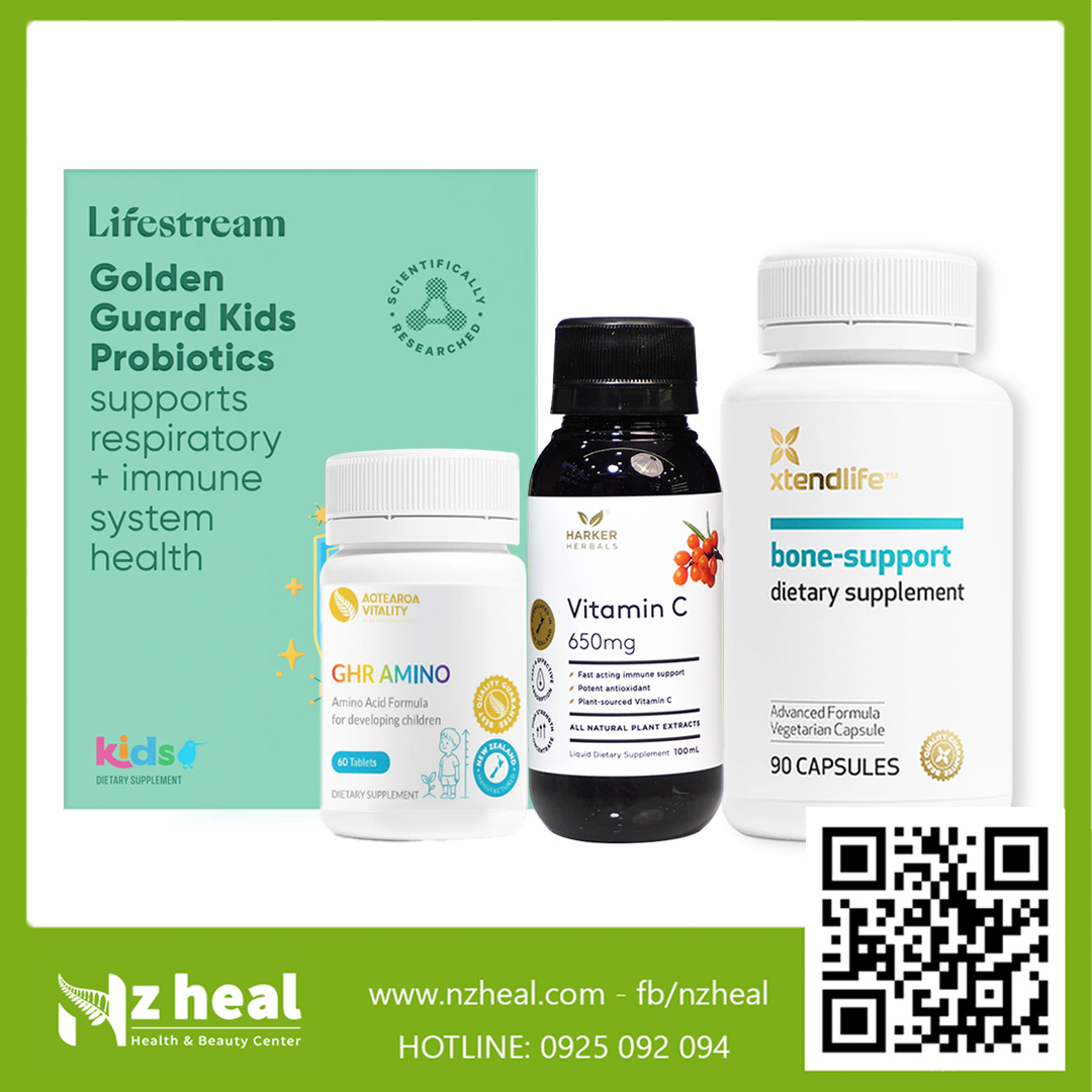 Sự phát triển toàn diện của trẻ không chỉ thể hiện ở chiều cao, mà còn phụ thuộc vào nền tảng xương chắc khỏe, hệ tiêu hóa ổn định và sức đề kháng vững vàng theo từng giai đoạn lớn lên. Bộ 4 tăng trưởng toàn diện cho bé: GHR Amino + Bone Support + Golden Probiotic + Vitamin C được xây dựng như một giải pháp đồng bộ, hỗ trợ quá trình phát triển toàn diện của bé: chiều cao, xương chắc khỏe, nuôi dưỡng hệ tiêu hóa và tăng cường miễn dịch. Sự kết hợp khoa học này giúp bé hấp thu tốt hơn, khỏe từ bên trong và sẵn sàng bứt phá trong giai đoạn phát triển vàng.