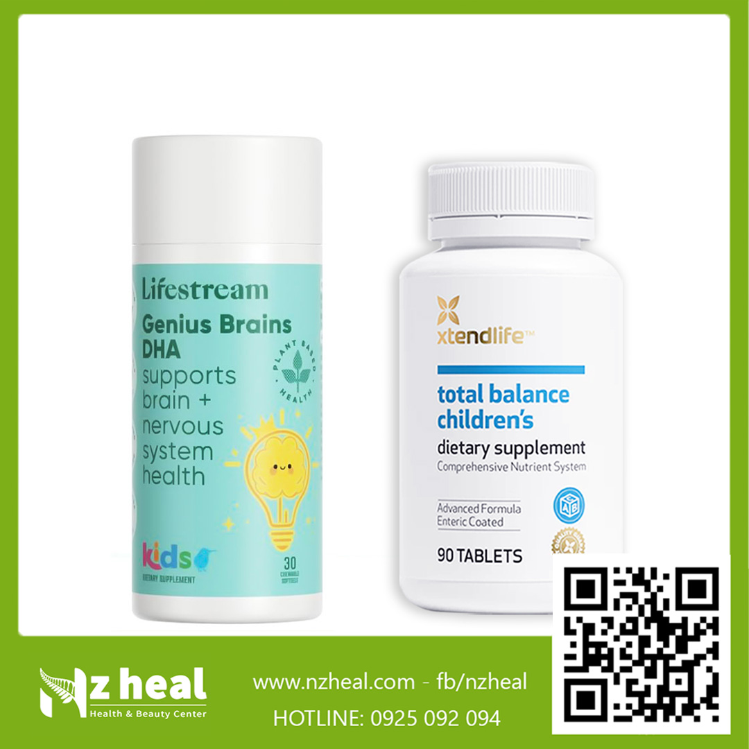 Giai đoạn vàng phát triển trí não của trẻ đòi hỏi sự bổ sung đầy đủ cả vi chất nền tảng lẫn dưỡng chất chuyên sâu cho não bộ. Combo Xtend-Life Total Balance Children’s kết hợp cùng Lifestream Genius Brains Kids DHA cung cấp vitamin, khoáng chất thiết yếu cho tăng trưởng toàn diện cũng như nuôi dưỡng não bộ, giúp trẻ tập trung tốt hơn, ghi nhớ hiệu quả và phát triển tư duy bền vững.