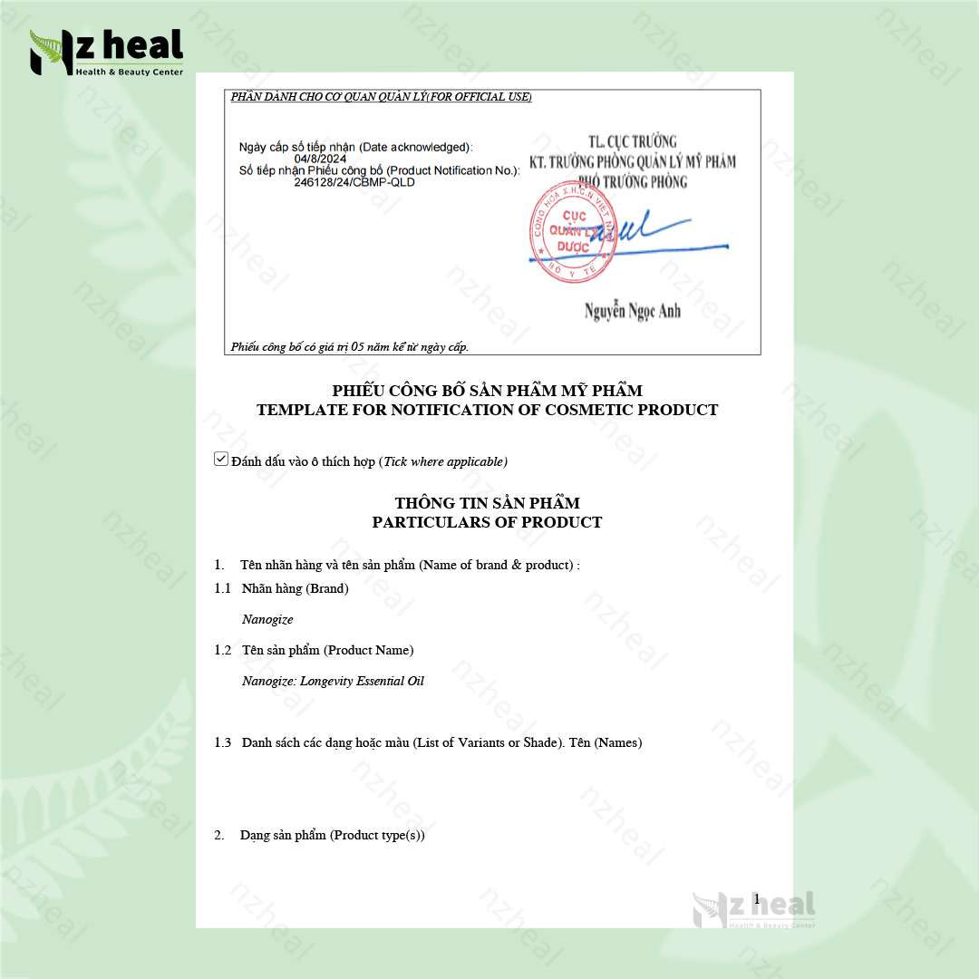 Tất cả được kết hợp hài hòa trong Nanogize Longevity Essential Oil Deep Penetrating, mang lại hiệu quả tối ưu cho sức khỏe và thư giãn.